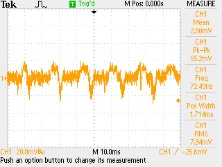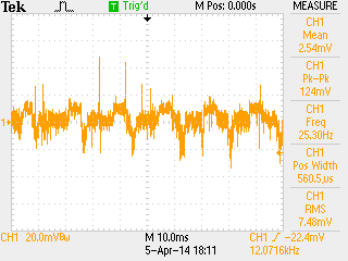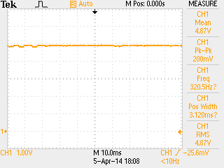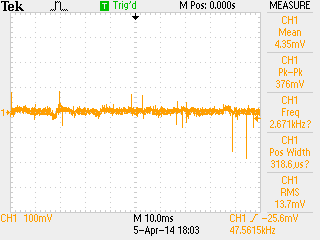 Other adaptors power supply measurement. ![]() This adaptor 5V 1A is use for charging a HTC phone. Open load voltage is 5.13V. Performance is good, voltage measuring 4.77V with noise 51.2mVp-p | |