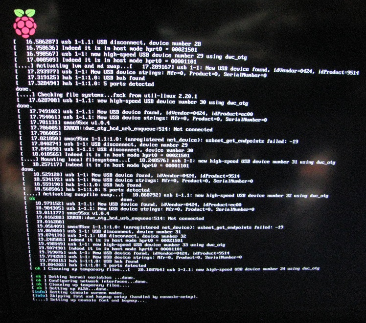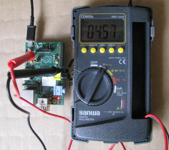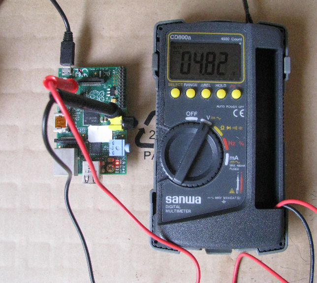 Measurement of micro USB cable 5V wire<0.5Ω>, Gnd wire<0.5Ω> 5V wire<0.5Ω>, Gnd wire<0.5Ω> 5V wire<0.5Ω>, Gnd wire<0.4Ω> 5V wire<1.6Ω>, Gnd wire<1.6Ω>. faulty cable. | If the micro USB cable that is used to power up the Raspberry Pi has a ohm too high, some of the built-in peripherals will fail. This can be observed during the boot up process. The booting takes longer than usual, and many error and unusual messages can be seen during the boot up. Retreiving network information from the gateway or router may fail as well. The internal miniSMD 6A fuse between the micro USB socket and pin TP1 is about 0.3Ω. This means that the total resistance from the power supply to the Raspberry Pi can be able 0.5Ω + 0.5Ω + 0.3Ω, which will be about 1.3Ω. If the Raspberry Pi is drawing about 0.4A, the voltage drop across the cable can be about 0.52V. |