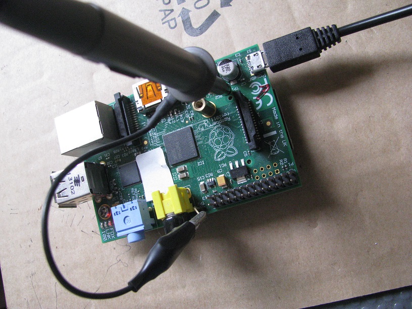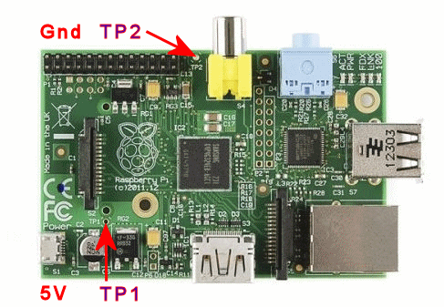 | Power Supply to take note for Raspberry Pi. Ensure to use a good stable power supply for your Raspberry Pi. Minimum recommended power supply is 5V 1A. Voltage measure on the test pin TP1 (5V, near the micro USB socket) and TP2 (Gnd, near the composite video RCA socket) should range between 4.75V - 5.25V when in operation. See the illustration on the right. Measure this test pin while the Raspberry Pi is booting after the boot up has complete. You will see the voltage fluctuating, because the device may draw more or less current during the operating process. It is ok for the voltage to drip below 4.75V, but it will be real bad if it drips below 4.5V. Voltage (TP1, TP2) 4.5V and below will be too low for the Raspberry Pi to operate normally. This is because there is a 3.3V LD1117-3v3 linear regulator which requires a minimum voltage drop of 1.2V in order to regular voltage properly. This means that the supply voltage has to be at least 4.5V. If it drips lower than this 4.5V, the components that are supplied with the regulated 3.3V may starts to fail. There are actually two more regulators that are used in the Raspberry. They are LP2980-2v5 (2.5V) and NCP1117-1v8 (1.8V). Components powered by these two regulators are usually not quite that affected, unless the supply voltage is much lower than 4.5V. You can actually study the schematic here to understand about the electronics used in a Raspberry Pi. If the voltage is not high enough, the network module will fail to retrieve network information, and other peripheral may fail during bootup time. Even if it can run, you may encounter suddenly failure in the process of operating the Raspberry Pi device. Any change in the Raspberry Pi configuration, where you attached other electronics or USB device, you will need to measure the voltage again to ensure that the power adaptor is able to handle it. Extra care should be taken to the USB micro cable as well. If the resistance of the cable is more than 1Ω, it should not be used to run the Raspberry Pi. The high ohm will result in a higher voltage drop. Failure can happen, even a good quality power supply adapter is used. USB micro cable should be about 0.5Ω or less. | ![]() Check out the location of TP1 (5V) and TP2 (Gnd) |