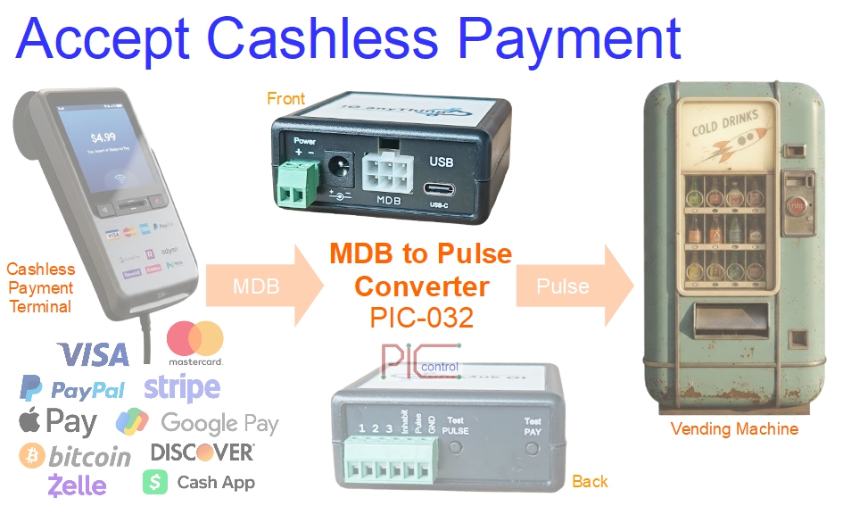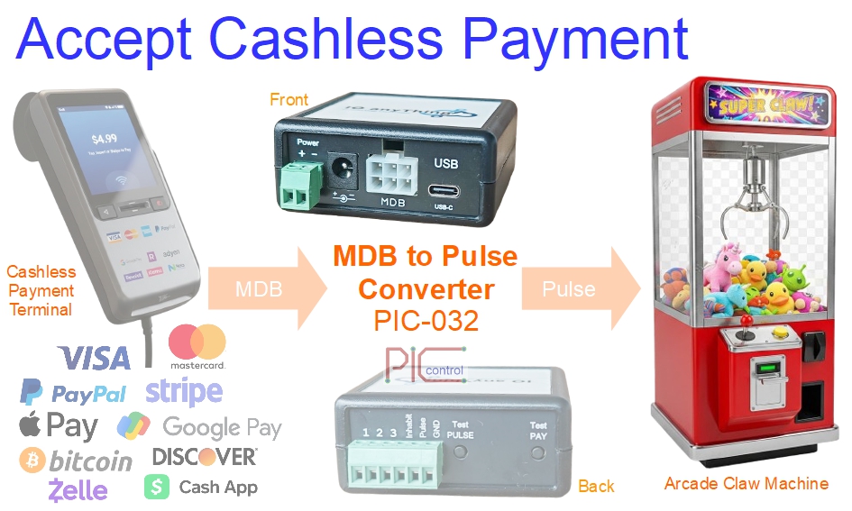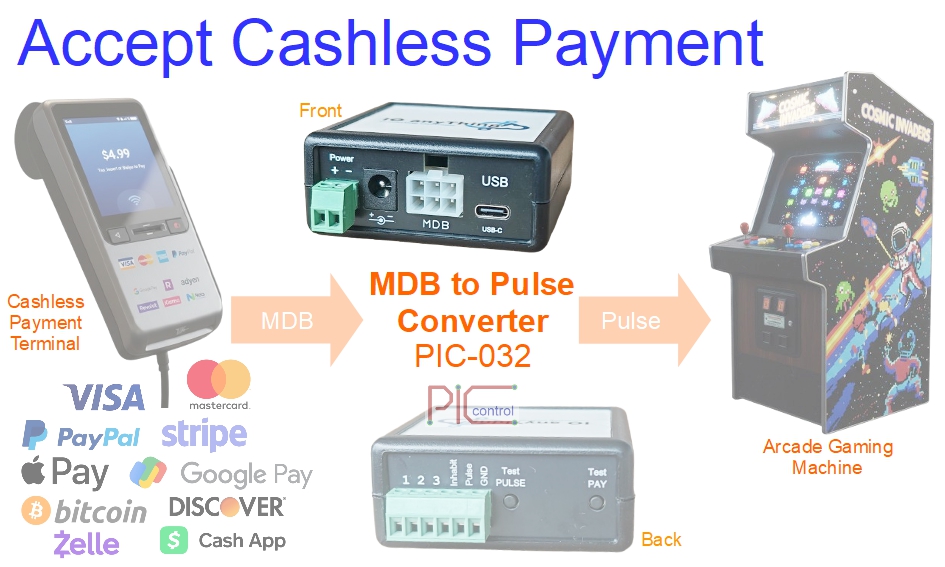 Upgrade your vending or gaming machines to accept modern cashless payments without replacing existing equipment. The PIC-032 board converts MDB cashless terminal signals to pulse inputs, enabling your machine to work with credit cards, mobile wallets, PayPal, crypto, and more.