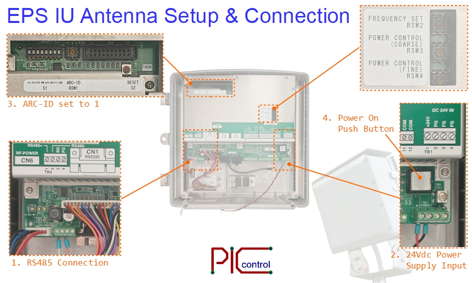 The following are some instructions for the wiring connection and configuration for the PIC-316-IU, the EPS IU Antenna, the network setup, and the control command communication protocol.