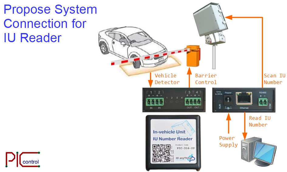 The vehicle detector will request IU scanning. If the IU number is read successfully, it will send the IU number to the computer, and will also activate an output, which can be used for opening the barrier.