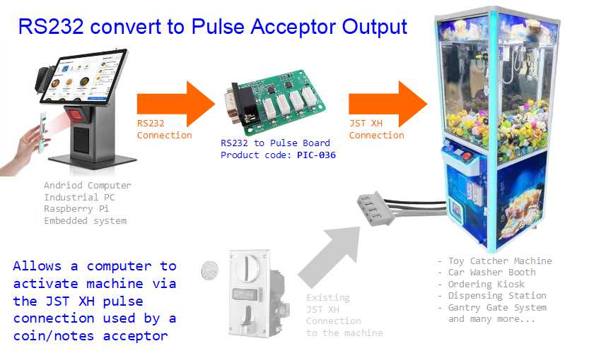 This is a device which allows you to simulate a pulse-based coin/note acceptor, to send a trigger signal to activate a vending machine. You can use your computer device to send an RS232 command to this board. The board will then send a trigger signal to activate your machine.